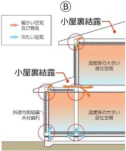 溢れたり破損箇所から等による雨水の侵入や、部屋間、外気との温度差等