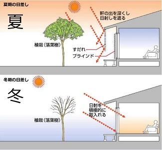 夏、広葉樹は緑が茂り暑さが凌げます。冬は葉が落ち太陽光が注ぎます。